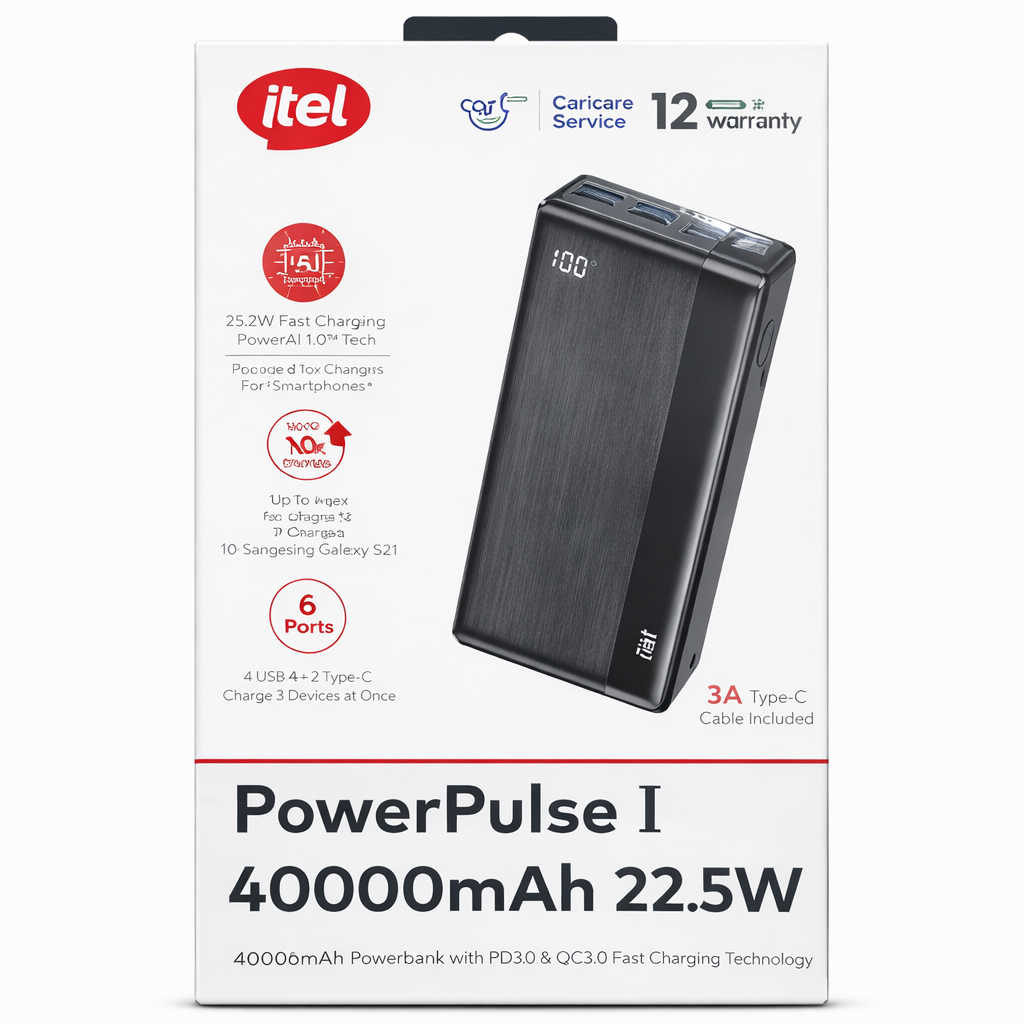 Never run out of power again with the Itel PowerPulse 40000mAh 22.5W Power Bank (A1490) the ultimate powerhouse built for users who demand reliable, ultra-fast charging on the go. Designed with Power AI Technology, this advanced power bank intelligently detects your device’s power needs to deliver safe, optimized, and efficient charging every time.